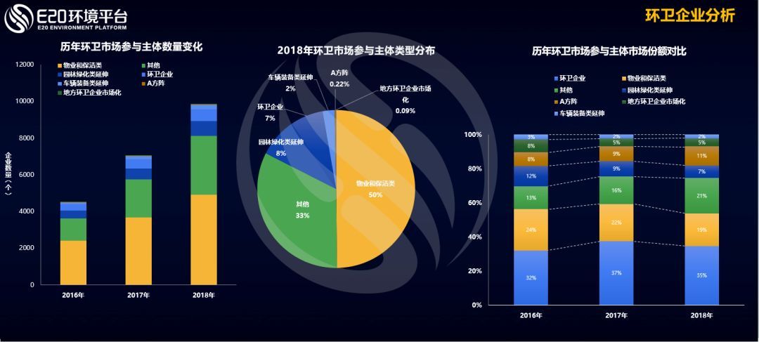 從環(huán)衛(wèi)市場(chǎng)參與主體來看,根據(jù)E20環(huán)境平臺(tái)E標(biāo)通統(tǒng)計(jì)顯示,近三年來,參與環(huán)衛(wèi)市場(chǎng)化項(xiàng)目爭奪的環(huán)衛(wèi)企業(yè)從五千家漲到了一萬家,參與主體大幅擴(kuò)增導(dǎo)致行業(yè)集中度未出現(xiàn)增長。(相關(guān)鏈接→ 5000+企業(yè)進(jìn)軍環(huán)衛(wèi)市場(chǎng) 環(huán)衛(wèi)一體化讓企業(yè)“腦洞”大開)E20研究院數(shù)據(jù)中心對(duì)環(huán)衛(wèi)企業(yè)進(jìn)行了企業(yè)原有業(yè)務(wù)來源分析可以看出,從事物業(yè)保潔、園林綠化等多種企業(yè)紛紛布局環(huán)衛(wèi)業(yè)務(wù)。在上圖右側(cè)特別值得注意的是:來自垃圾焚燒A方陣的部分投資運(yùn)營企業(yè)已進(jìn)入環(huán)衛(wèi),在前年8%的市場(chǎng)規(guī)模占比,在今年已經(jīng)上漲到11%,在進(jìn)入企業(yè)大擴(kuò)容的基礎(chǔ)上其份額反而逆勢(shì)穩(wěn)健提高,說明我們這些垃圾焚燒影響力企業(yè)的市場(chǎng)沖擊力何等之大。