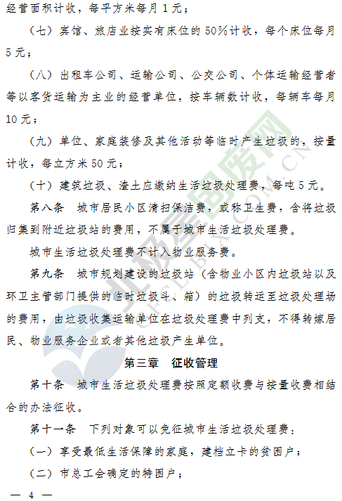 (九)單位、家庭裝修及其他活動等臨時產(chǎn)生垃圾的,按量計收,每立方米50元;