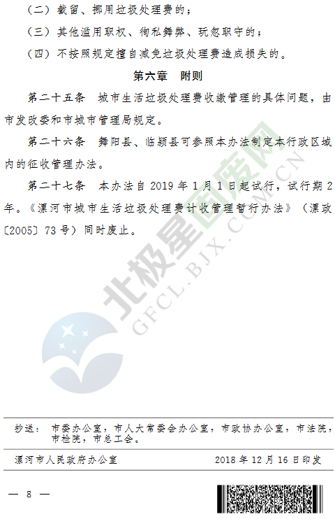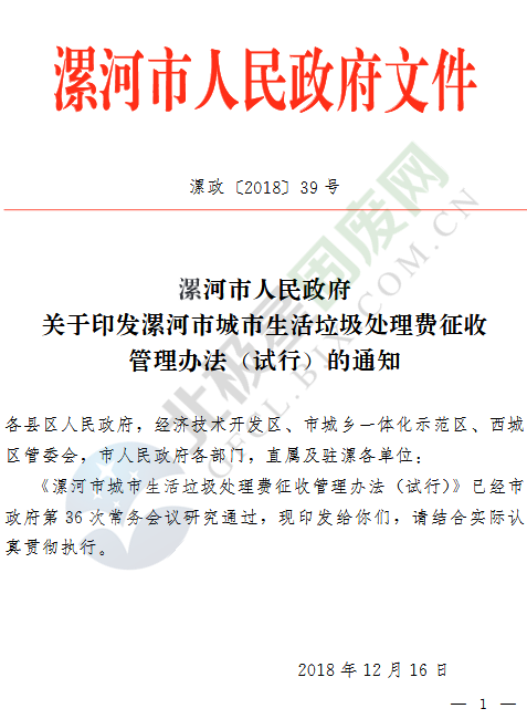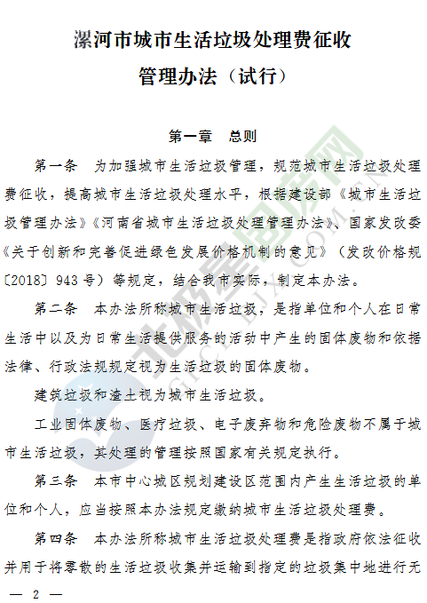 中國固廢網(wǎng)獲悉,日前,《漯河市城市生活垃圾處理費征收管理辦法(試行)》已經(jīng)河南漯河市政府第36次常務會議研究通過,并于2019年1月1日起試行。《漯河市城市生活垃圾處理費征收管理辦法(試行)》是對《漯河市城市生活垃圾處理費計收管理暫行辦法》(漯政〔2005〕73號)的完善修訂。