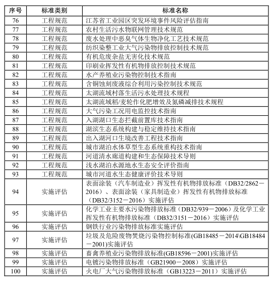 根據(jù)國(guó)家環(huán)境質(zhì)量標(biāo)準(zhǔn)體系,結(jié)合我省實(shí)際,制訂《環(huán)境空氣質(zhì)量 非甲烷總烴限值》《土壤污染物篩選值及修復(fù)目標(biāo)值》《江蘇海域海水水質(zhì)評(píng)價(jià)標(biāo)準(zhǔn)》等3項(xiàng)地方環(huán)境質(zhì)量標(biāo)準(zhǔn);制(修)訂《鉛蓄電池行業(yè)大氣污染物排放限值》《工業(yè)爐窯大氣污染物排放標(biāo)準(zhǔn)》等26項(xiàng)污染物排放標(biāo)準(zhǔn);制訂《生物中氚和碳-14的測(cè)定 液體閃爍計(jì)數(shù)法》《水中鉛-210的測(cè)定 冠醚樹(shù)脂色層法》等11項(xiàng)監(jiān)測(cè)規(guī)范;制訂《企業(yè)(污染源)全過(guò)程環(huán)境管理規(guī)范》《廢線路板綜合利用污染控制技術(shù)規(guī)范》等24項(xiàng)管理規(guī)范;制訂《污染源自動(dòng)監(jiān)控系統(tǒng)數(shù)據(jù)傳輸擴(kuò)展標(biāo)準(zhǔn)》《江蘇省太湖流域水生態(tài)健康評(píng)估技術(shù)方法》等29項(xiàng)工程技術(shù)規(guī)范;開(kāi)展對(duì)江蘇省《表面涂裝(汽車制造業(yè))揮發(fā)性有機(jī)物排放標(biāo)準(zhǔn)》《表面涂裝(家具制造業(yè))揮發(fā)性有機(jī)物排放標(biāo)準(zhǔn)》等7項(xiàng)標(biāo)準(zhǔn)的實(shí)施評(píng)估。
