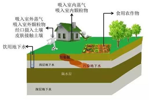 在這里,污染源是受污染的土壤或者地下水,受體是人,暴露途徑是污染物進(jìn)入人體的方式。土壤或地下水中污染物進(jìn)入到人體的量即是基于暴露途徑來(lái)計(jì)算的,稱暴露量,這個(gè)計(jì)算過(guò)程稱暴露評(píng)估。具體暴露途徑參考下圖。
