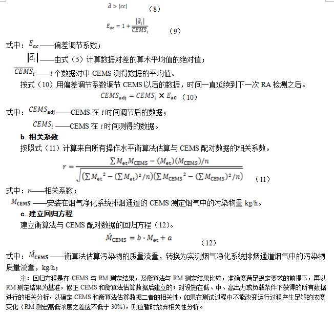 由排放系數(shù)計算煙氣凈化之后污染物的排放量(物料衡算法,簡稱衡算法),同時用RM和CEMS法測定污染物排放量。由衡算法與RM的相對準(zhǔn)確度(RA)及CEMS法與RM的RA,分別判定衡算法和CEMS法的測定結(jié)果,當(dāng)RA≤25%時,測定結(jié)果可采用(如果與RM數(shù)據(jù)對差的算術(shù)平均值大于置信系數(shù),則應(yīng)用偏差系數(shù)修正衡算法和/或CEMS法的數(shù)據(jù))。建立衡算法估算污染物的排放量與CEMS法測定數(shù)據(jù)的回歸方程,回歸方程的相關(guān)系數(shù)應(yīng)≥0.75。此后,將衡算法估算的污染物小時質(zhì)量流量(kg/h)代入回歸方程,獲得的結(jié)果與CEMS在相應(yīng)時間測定污染物質(zhì)量流量(kg/h)比較,相對誤差≤25%,判定CEMS測定數(shù)據(jù)可接收。