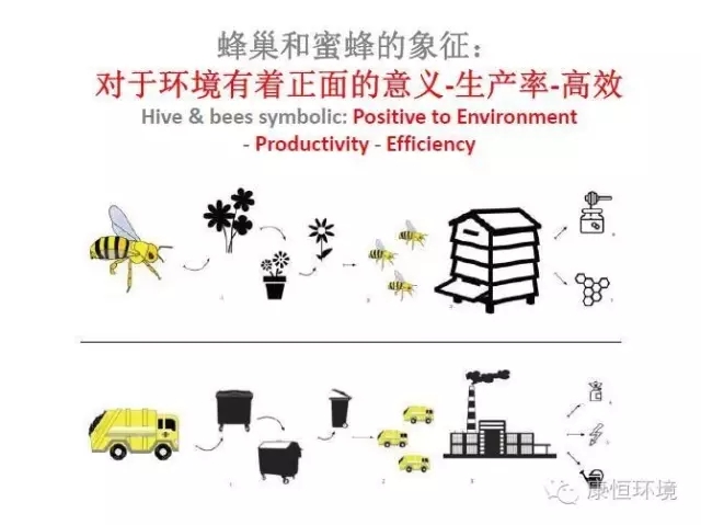 蜂巢狀玻璃幕墻的設(shè)計(jì)靈感來(lái)源于蜜蜂把花粉釀蜜的過(guò)程。設(shè)計(jì)師把每天奔波在城市中的眾多垃圾回收車輛比喻蜜蜂收集花粉的過(guò)程,把生活垃圾焚燒發(fā)電廠比喻蜂巢,將收集的生活垃圾在焚燒發(fā)電廠變成清潔能源的過(guò)程比喻蜜蜂釀蜜,非常形象的展現(xiàn)了康恒寧波鄞州垃圾焚燒發(fā)電廠的建造理念。