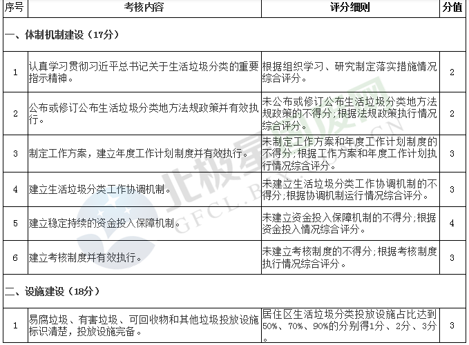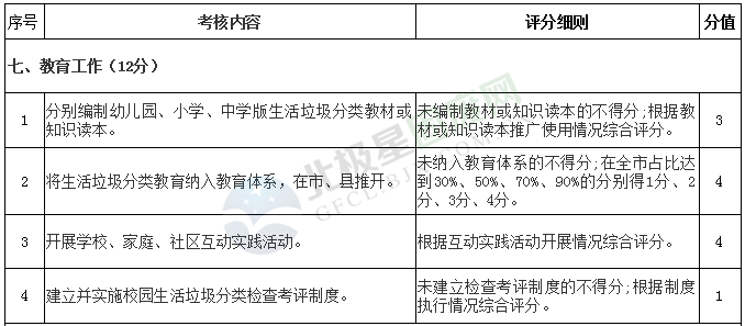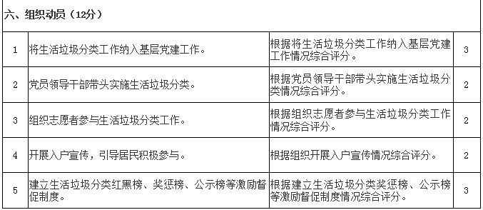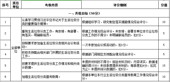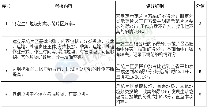 《辦法》突出針對性。針對地方和部門分別制定了生活垃圾分類工作評價考核細則。對地方評價考核突出政府主體責任,提出了體制機制建設(shè)、設(shè)施建設(shè)、示范片區(qū)建設(shè)、公共機構(gòu)、分類作業(yè)、組織動員、教育工作、宣傳工作、信息報送、加減分項等十個方面工作。對部門評價考核側(cè)重協(xié)調(diào)配合、行業(yè)指導,提出了共性目標和單位目標。