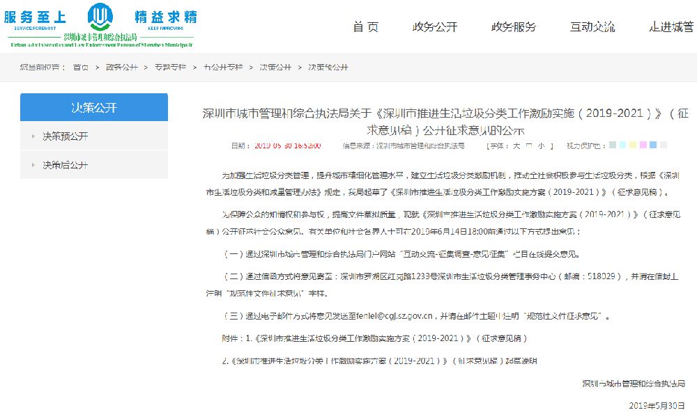 近日,深圳市城市管理和綜合執(zhí)法局網(wǎng)站發(fā)布關(guān)于《深圳市推進生活垃圾分類工作激勵實施方案(2019-2021)》(征求意見稿)公開征求意見的公示,2019-2021年期間,深圳市每年安排生活垃圾分類激勵補助資金9375萬元,其中,各區(qū)財政共承擔6250萬元,市財政安排3125萬元。生活垃圾分類積極個人資金補助為1000元。