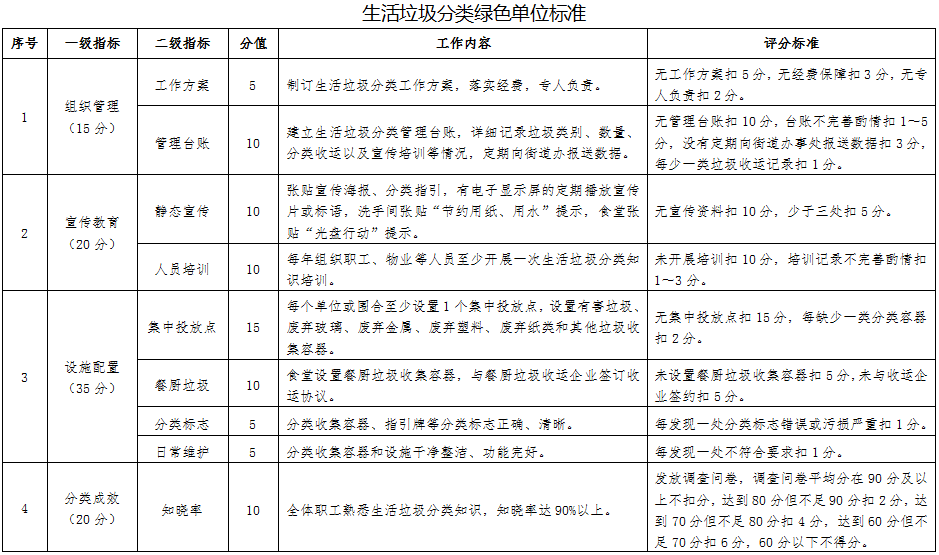 “生活垃圾分類綠色單位”指開展生活垃圾分類且成效顯著的黨政機關(guān)、事業(yè)單位、學(xué)校、企業(yè)和社會組織,應(yīng)具備以下條件: