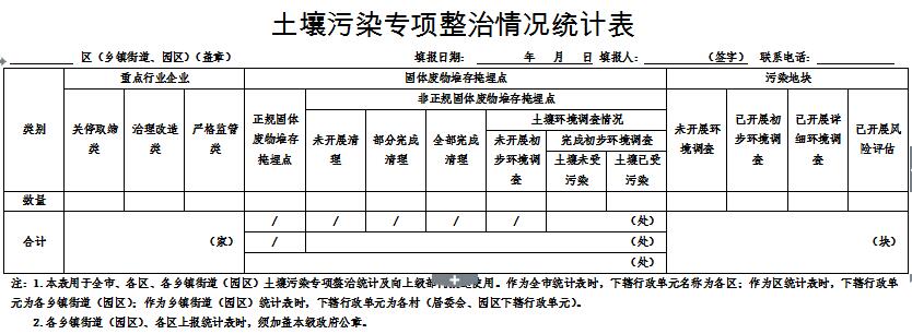 (三)嚴(yán)格執(zhí)行登記制度。各區(qū)要按照方案要求,按時(shí)完成各項(xiàng)工作,于6月30日前向市環(huán)保局報(bào)送土壤質(zhì)量與修復(fù)規(guī)劃;7月15日前向市環(huán)保局報(bào)送各類登記表(附件1);11月30日前向市環(huán)保局報(bào)送各類花名冊(附件2)和土壤污染專項(xiàng)整治情況統(tǒng)計(jì)表(附件3)。同時(shí)向市市容園林委報(bào)送涉及城鎮(zhèn)生活垃圾相關(guān)內(nèi)容,向市農(nóng)委報(bào)送涉及村莊內(nèi)生活垃圾相關(guān)內(nèi)容。