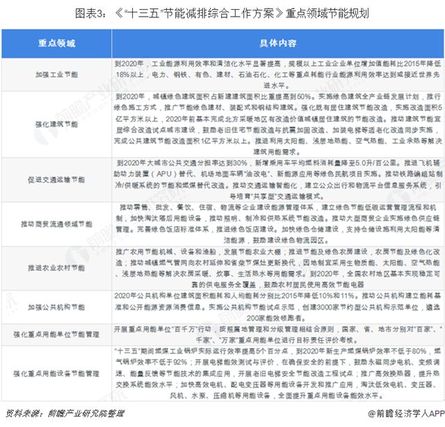 2016年國(guó)務(wù)院印發(fā)《“十三五”節(jié)能減排綜合工作方案》(以下簡(jiǎn)稱《方案》),明確了“十三五”節(jié)能減排工作的主要目標(biāo)和重點(diǎn)任務(wù),對(duì)全國(guó)節(jié)能減排工作進(jìn)行全面部署。方案中指出:到2020年,全國(guó)萬元國(guó)內(nèi)生產(chǎn)總值能耗比2015年下降15%,能源消費(fèi)總量控制在50億噸標(biāo)準(zhǔn)煤以內(nèi)。同時(shí),相應(yīng)的配套政策也已經(jīng)出臺(tái)。