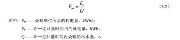 企業(yè)在一定計量時間內(nèi)處理單位污水需要消耗的用電量,耗電量僅計算處理污水達到要求的排放標(biāo)準時所消耗的電量,不含再生利用過程消耗的電能(同時包括辦公使用的耗電量,不包括基建、生活用耗電量等)。按公式6-2計算: