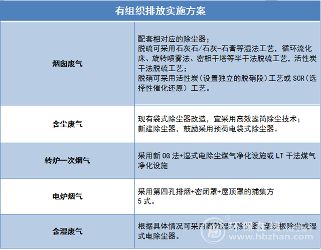 在選取技術(shù)上,《實(shí)施指南》對(duì)煙囪廢氣、含塵廢氣、轉(zhuǎn)爐一次煙氣、電爐煙氣和含濕廢氣等提供了相對(duì)應(yīng)的配套設(shè)施建議等,該采取怎樣的工藝方式等也進(jìn)行了詳細(xì)的說(shuō)明。具體如下表: