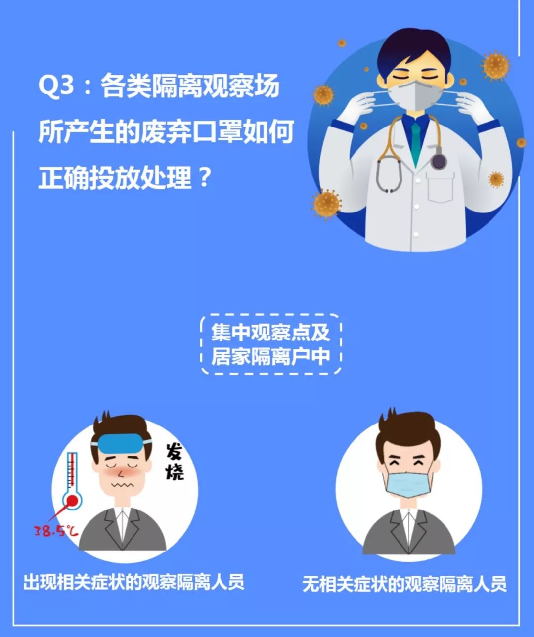 各居家隔離點(diǎn)(戶)、集中觀察點(diǎn)產(chǎn)生的廢棄口罩,應(yīng)嚴(yán)格按照上海市防控新型冠狀病毒感染肺炎疫情重點(diǎn)人員集中隔離觀察場(chǎng)所技術(shù)工作規(guī)范要求,由隔離牽頭部門負(fù)責(zé)指導(dǎo)屬地部門設(shè)立臨時(shí)存放點(diǎn),與日常產(chǎn)生的生活垃圾予以專門存放。