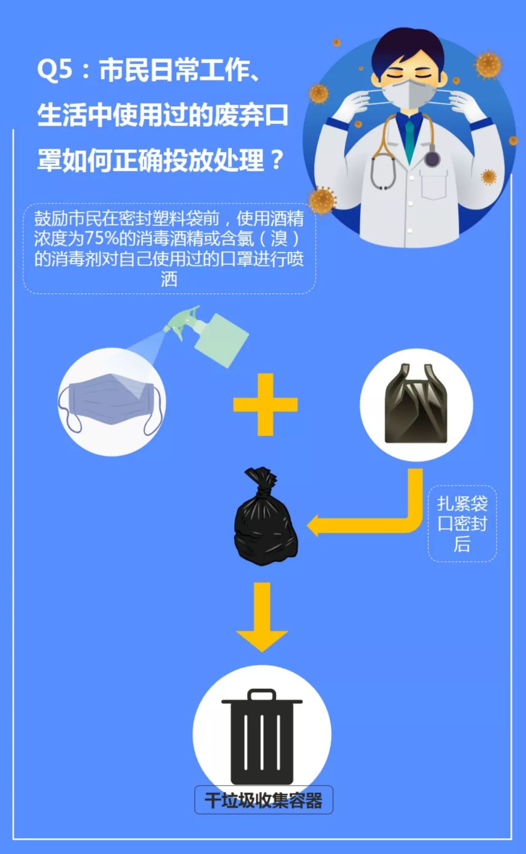 鼓勵(lì)市民在密封塑料袋前,使用酒精濃度為75%的消毒酒精或含氯(溴)的消毒劑對(duì)自己使用過的口罩進(jìn)行噴灑,為后續(xù)極有可能會(huì)接觸、處理產(chǎn)生的廢棄物的工作人員,主動(dòng)提供一份安全關(guān)懷保障。