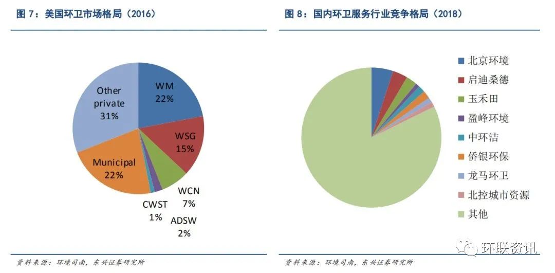 而國內(nèi)環(huán)衛(wèi)服務(wù)公司以清掃為主,從事收集轉(zhuǎn)運(yùn)、也必須以清掃為入口才能切入,從而導(dǎo)致中國的環(huán)衛(wèi)市場(chǎng)較為分散。從商業(yè)模式來看,表現(xiàn)為美國的環(huán)衛(wèi)服務(wù)企業(yè)更為資本密集型,而國內(nèi)的環(huán)衛(wèi)服務(wù)企業(yè)為勞動(dòng)密集型企業(yè)。