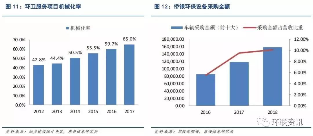 環(huán)衛(wèi)機(jī)械化率提升。近幾年我國市政環(huán)衛(wèi)機(jī)械化進(jìn)程較快,上市公司的機(jī)械設(shè)備采購金額占比明顯提升,據(jù)披露,玉禾田機(jī)械設(shè)備采購金額 2017 年和 2018 年的增幅分別達(dá)到 108.86%、54.99%,分別占營業(yè)收入12.18%、14.42%;僑銀環(huán)保 2017 年和 2018 年的增幅分別達(dá)到 137.73%、40.47%,分別占營業(yè)收入 9.51%、10.06%。此外,國務(wù)院住建部城鄉(xiāng)建設(shè)統(tǒng)計(jì)公報(bào)顯示,機(jī)械化清掃率從 2012 年的 42.8%提升到 2017 年的65.0%。由于目前機(jī)械化數(shù)據(jù)統(tǒng)計(jì)標(biāo)準(zhǔn)較為寬松,較多機(jī)械化清掃后的面積仍需通過人工再清理,雖然數(shù)據(jù)提升較快,但我國目前的機(jī)械化程度仍處于較低水平。