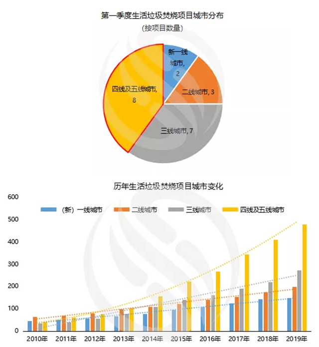 從項(xiàng)目分布維度看,2020年第一季度的生活垃圾焚燒項(xiàng)目主要集中在三線、四線和五線城市。其中:一線城市無(wú)新增;新一線和二線城市分別中標(biāo)2個(gè)和3個(gè)項(xiàng)目;三線城市中標(biāo)7個(gè)項(xiàng)目,四線及五線城市中標(biāo)8個(gè)項(xiàng)目,這與E20環(huán)境平臺(tái)執(zhí)行合伙人、E20研究院執(zhí)行院長(zhǎng)、湖南大學(xué)兼職教授薛濤在“2019(第十三屆)固廢戰(zhàn)略論壇”上對(duì)生活垃圾增量市場(chǎng)的預(yù)測(cè)相吻合:一線城市基本瓜分完畢,生活垃圾焚燒市場(chǎng)逐漸向三四五線城市下沉。