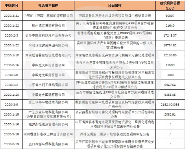 2020的四分之一已過(guò),E20研究院數(shù)據(jù)中心對(duì)第一季度固廢市場(chǎng)進(jìn)行盤點(diǎn):(1)從E標(biāo)通獲悉,2020年第一季度社會(huì)資本共計(jì)中標(biāo)49個(gè)固廢投資運(yùn)營(yíng)項(xiàng)目,投資總額超142億元。(2)1-3月固廢項(xiàng)目中標(biāo)趨勢(shì)呈現(xiàn)出“√”型曲線,2月部分項(xiàng)目受疫情影響導(dǎo)致延期或停滯,中標(biāo)項(xiàng)目數(shù)量?jī)H個(gè)位數(shù),3月隨著疫情得到有效控制出現(xiàn)回升態(tài)勢(shì)。(3)焚燒市場(chǎng)釋放投資額超106億元,與2019年同期相比,投資額同比上漲15.4%,項(xiàng)目數(shù)量與日處理能力較同期持平;焚燒市場(chǎng)依舊延續(xù)歷史趨勢(shì),向四五線城市下沉。民企社會(huì)資本中康恒環(huán)境表現(xiàn)不俗,共計(jì)中標(biāo)6個(gè)項(xiàng)目。(4)第一季度,(含)餐廚/廚余處理處置項(xiàng)目共計(jì)成交16個(gè),8成項(xiàng)目落定長(zhǎng)江經(jīng)濟(jì)帶地區(qū)。(5)建筑垃圾處置市場(chǎng)同樣值得關(guān)注,一季度數(shù)據(jù)中心從E標(biāo)通獲悉建筑垃圾處置項(xiàng)目8個(gè),75%的項(xiàng)目中標(biāo)地為華東地區(qū)。(6)除上述細(xì)分領(lǐng)域外,生物質(zhì)發(fā)電、畜禽糞污等其他細(xì)分領(lǐng)域文中均有涉及,詳見(jiàn)正文。