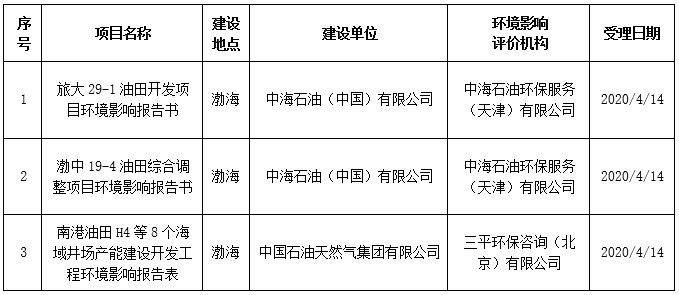 原標(biāo)題:生態(tài)環(huán)境部關(guān)于2020年4月13日—2020年4月17日海洋工程建設(shè)項(xiàng)目環(huán)境影響評(píng)價(jià)文件受理情況的公示