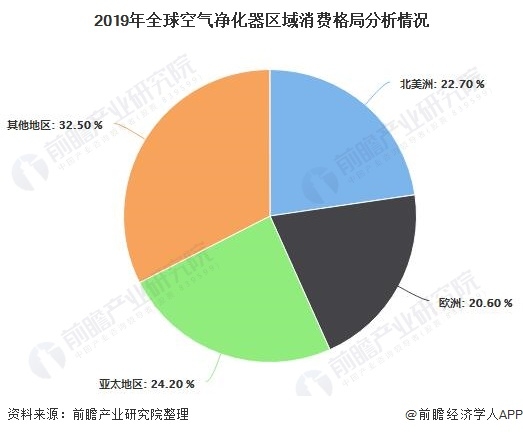 從全球空氣凈化器區(qū)域消費(fèi)格局來看,2019年北美和歐洲的市場份額占比較大,分別為22.70%和20.60%,亞太地區(qū)市場份額占比為24.20%,已經(jīng)超過北美洲和歐洲,其他區(qū)域占比之和為32.50%。