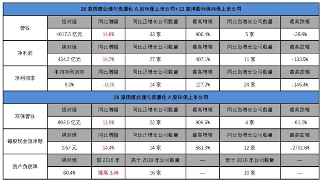 總體來看,2019年固廢處理與資源化A股及港股環(huán)保上市公司總體成長(zhǎng)表現(xiàn)和獲利能力均優(yōu)于上年,營(yíng)收和凈利潤(rùn)總額雙雙同比增長(zhǎng);現(xiàn)金流情況有所改善,負(fù)債水平高于上年。