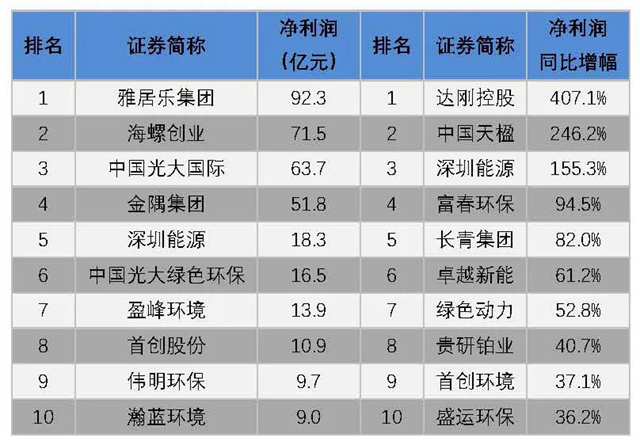 2019年大氣污染防治(A股+港股)環(huán)保上市公司凈利潤(rùn)及其同比增幅TOP10