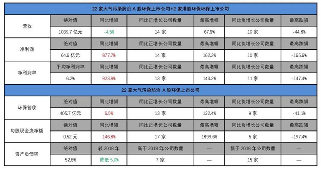 總體來看,2019年大氣污染防治A股及港股環(huán)保上市公司總體成長(zhǎng)表現(xiàn)不及2018年;整體獲利能力明顯優(yōu)于上年,凈利潤(rùn)總額和凈利潤(rùn)率均同比大幅增長(zhǎng);現(xiàn)金流情況改善明顯,負(fù)債水平下降。