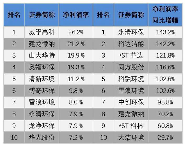 2019年水污染防治(A股+港股)環(huán)保上市公司凈利潤(rùn)率及其同比增幅TOP10