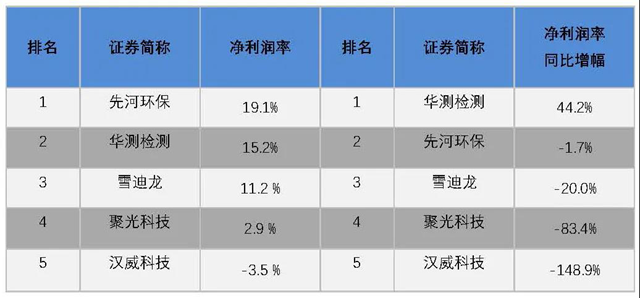 2019年環(huán)境監(jiān)測(cè)與檢測(cè)A股環(huán)保上市公司凈利潤(rùn)率及其同比增幅排名