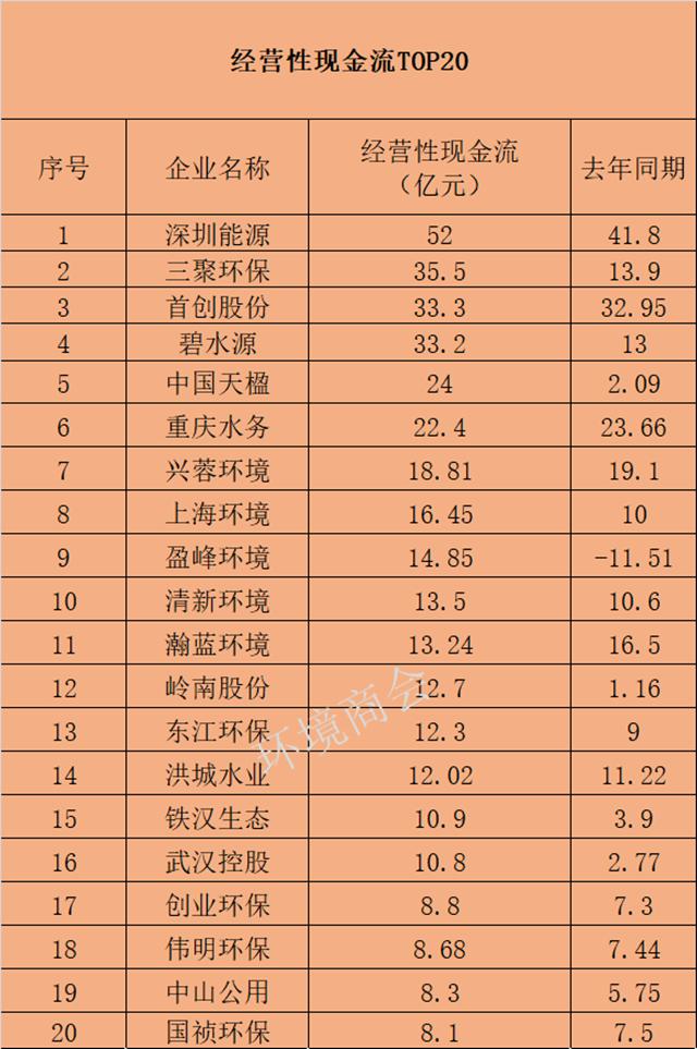 一是具有穩(wěn)定收益的地方國資現(xiàn)金流狀況良好。在經(jīng)營性現(xiàn)金流排行的前20名中,首創(chuàng)股份、重慶水務、興蓉環(huán)境、上海環(huán)境、瀚藍環(huán)境、洪城水業(yè)、中山公用等企業(yè)表現(xiàn)出一個共同的特征--現(xiàn)金流穩(wěn)定且相對充裕。這些企業(yè)大部分都又很明顯的屬地特征,從地方成長起來,手握大量能提供穩(wěn)定現(xiàn)金流的水務或固廢等項目,與此同時,在上一輪PPP激戰(zhàn)中它們多數(shù)參與不深或并未參與,因此,在這輪危機中現(xiàn)金流受影響明顯小很多,抗沖擊能力強勁。