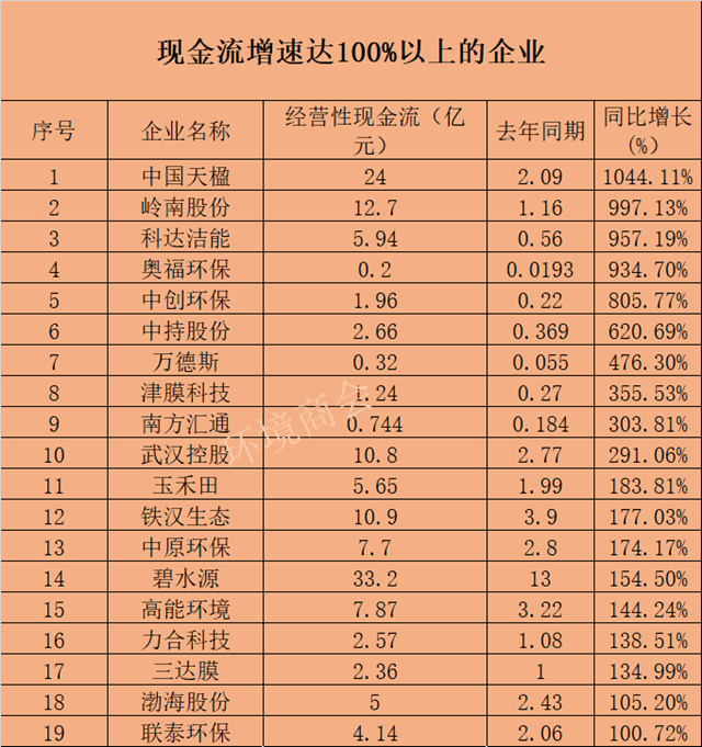 從增長幅度來看,有63家企業(yè)現(xiàn)金流正增長,占比超七成,另有23家下降。在2018年、2019年經(jīng)營性現(xiàn)金流均為正流入的企業(yè)中,增長幅度超50%的企業(yè)有28家,其中中國天楹(1044.11%)、嶺南股份(997.13%)、科達潔能(957.19%)、奧福環(huán)保(934.70%)、中創(chuàng)環(huán)保(805.77%)、中持股份(620.69%)等增長頗為強勁。