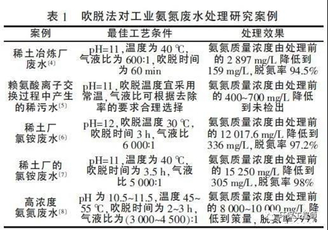 通過(guò)對(duì)比分析表1 可以得出:(1)吹脫法普遍適宜的pH 在11 附近;(2)考慮經(jīng)濟(jì)因素,溫度在30~40 ℃附近較為可行,且處理率高;(3)吹脫時(shí)間為3 h左右;(4)氣液比在5 000∶1 左右效果較好,且吹脫溫度越高,氣液比越??;(5)吹脫后廢水的濃度可降低到中低濃度;(6)脫氮率基本保持90%以上。盡管吹脫法可以將大部分氨氮脫除, 但處理后的廢水中氨氮仍然高達(dá)100 mg/L 以上,無(wú)法直接排放,還需要后續(xù)深度處理