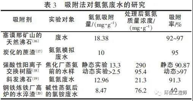該法一般只適用于低濃度氨氮廢水, 而對(duì)于高濃度的氨氮廢水, 使用吸附法會(huì)因吸附劑更換頻繁而造成操作困難, 因此需要結(jié)合其他工藝來(lái)協(xié)同完成脫氮過(guò)程。供吸附法使用的吸附劑很多, 但不同吸附劑對(duì)廢水中氨氮的吸附量卻有很大不同, 表3 對(duì)比了部分吸附劑的吸附效果。