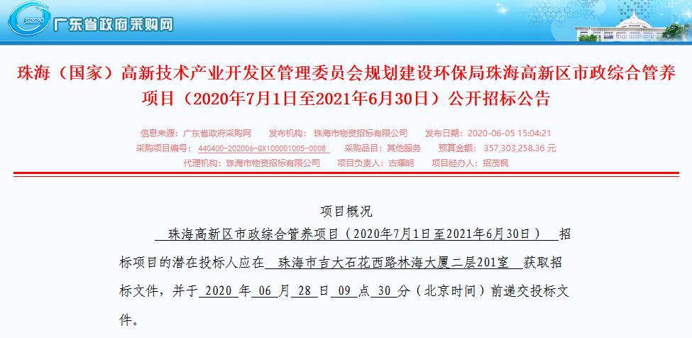 按照開標計劃,6月28日,采購預算高達357,303,258.36元/年的珠海高新區(qū)市政綜合管養(yǎng)項目將公布中標結(jié)果。