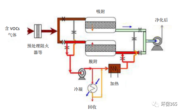 采用活性炭作為吸附劑,采用惰性氣體循環(huán)加熱脫附分流冷凝回收的工藝對有機(jī)氣體進(jìn)行凈化和回收?;厥找和ㄟ^后續(xù)的精制工藝可實(shí)現(xiàn)有機(jī)物的循環(huán)利用。工藝原理示意圖如下: