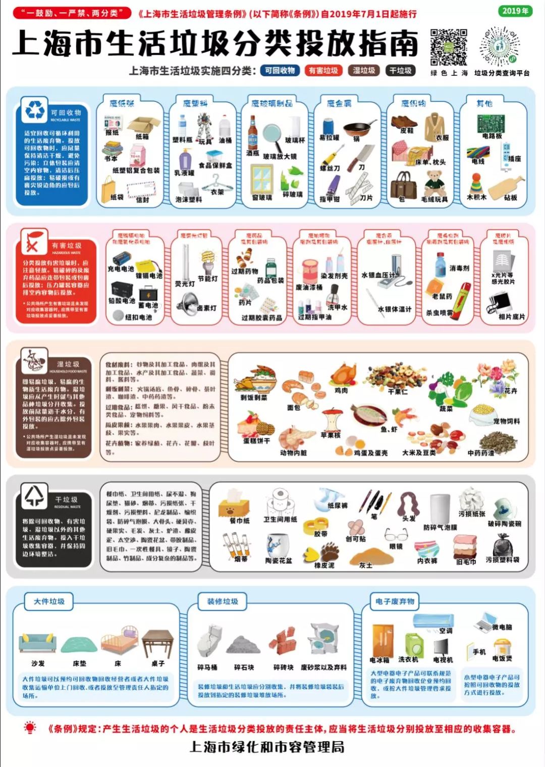 2019年,《上海市生活垃圾管理?xiàng)l例》頒布施行,全市1.3萬(wàn)余個(gè)居村分類(lèi)達(dá)標(biāo)率由2018年年底的15%提高到90%,單位分類(lèi)達(dá)標(biāo)率達(dá)到87%,135個(gè)街鎮(zhèn)成功創(chuàng)建為“示范街鎮(zhèn)”,10個(gè)區(qū)創(chuàng)建成為“示范區(qū)”,下發(fā)首批71個(gè)垃圾分類(lèi)示范街鎮(zhèn)專(zhuān)項(xiàng)補(bǔ)貼??苫厥瘴锘厥樟?049噸/日、環(huán)比增長(zhǎng)431.8%,有害垃圾分出量0.6噸/日、環(huán)比增長(zhǎng)504.1%,濕垃圾分出量7453噸/日、環(huán)比增長(zhǎng)88.8%,干垃圾處置量17731噸/日、環(huán)比下降17.5%。完成2.1萬(wàn)余個(gè)分類(lèi)投放點(diǎn)規(guī)范化改造,完成4萬(wàn)余只道路廢物箱標(biāo)識(shí)更新,配置及涂裝237輛可回收物回收車(chē)、87輛有害垃圾車(chē)、1461輛濕垃圾車(chē)和3079輛干垃圾車(chē),建成可回收物回收服務(wù)點(diǎn)1.5萬(wàn)個(gè)、中轉(zhuǎn)站201個(gè)、集散場(chǎng)10個(gè),餐廚廢棄油脂收運(yùn)、處置閉環(huán)管理落實(shí)到位。干垃圾焚燒和濕垃圾資源化利用總量從1.4萬(wàn)噸/日提高到2.1萬(wàn)噸/日,生活垃圾填埋比例從41.4%下降到20%。