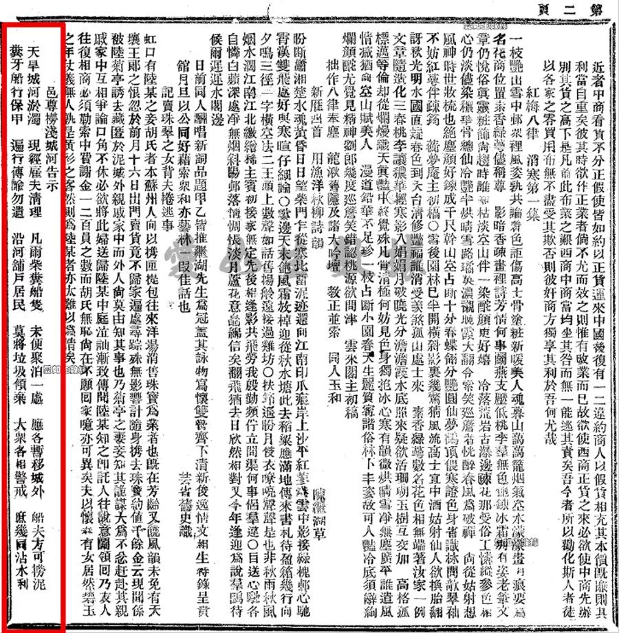 1872年12月27日《申報(bào)》一則題為“邑尊撈淺城河告示”的消息,其中提及“沿河鋪戶(hù)居民 莫將垃圾傾棄 大眾各相警戒 庶幾同沾水利”