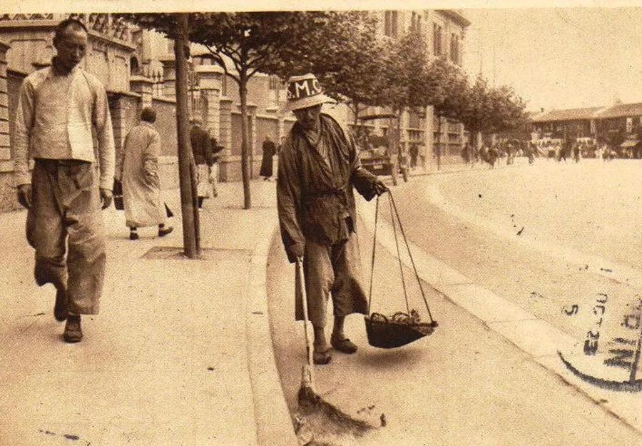 民國(guó)初年,上海街頭的清道夫。帽子上有S.M.C 字樣,意為上海工部局的英文縮寫(xiě)