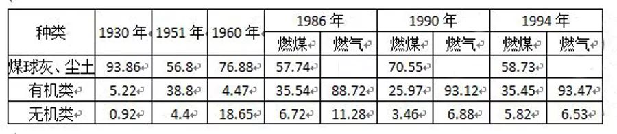 注:(1)1930年數(shù)據(jù)以公共租界統(tǒng)計(jì)資料為依據(jù);(2)1986年后居民生活垃圾成分為使用燃煤制品和煤氣兩類(lèi)地區(qū)統(tǒng)計(jì)