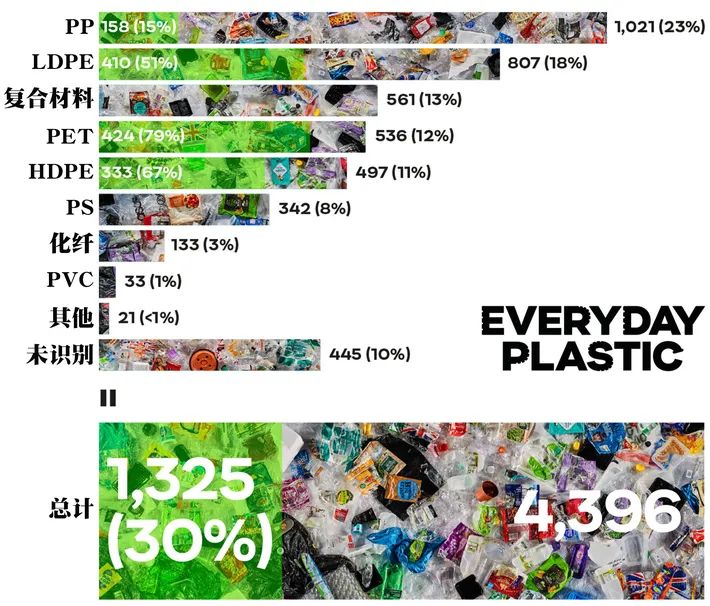 如果按照塑料種類來說,這些塑料垃圾一半以上為PP(如意大利面包裝袋)、LDPE(如吐司面包包裝袋)和復合塑料(如薯片包裝袋)。而PET(如飲料瓶)和HDPE(如牛奶桶)這兩種英國體系中最容易被回收利用的塑料的占比卻不到四分之一。