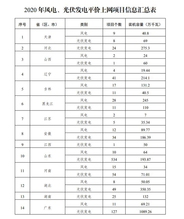 國(guó)家發(fā)展改革委辦公廳 國(guó)家能源局綜合司關(guān)于公布2020年風(fēng)電、光伏發(fā)電平價(jià)上網(wǎng)項(xiàng)目的通知