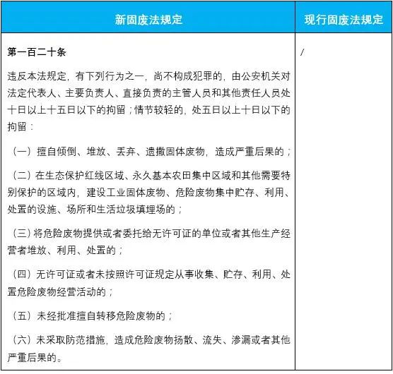 新固廢法對法律責(zé)任專章進(jìn)行了擴(kuò)充完善,加大了對固廢管理不合規(guī)的處罰力度,增加了企業(yè)的違法成本。除了對新增內(nèi)容設(shè)定了相應(yīng)罰則外,還普遍提高了違法行為的處罰金額,最高可罰至500萬元,并且增加了按日連續(xù)處罰、行政拘留、查封扣押等執(zhí)法措施,這些嚴(yán)格的法律責(zé)任變化也值得企業(yè)的特別關(guān)注。