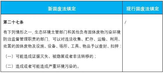 4.明確了對違法收集、貯存、運(yùn)輸、利用、處置的固體廢物及設(shè)施、設(shè)備、場所、工具、物品予以查封、扣押的規(guī)定