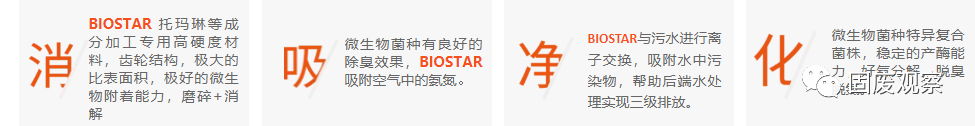 本技術采用的BIOSTAR生物載體, 采用托瑪琳等成分加工的高硬度材料,硬度較牙齒更高。可以高效協(xié)助磨碎大顆粒的有機物。載體材料對人體無害,通過獨特加工工藝在載體中制造更多適合微生物體積的小孔,具有極好的微生物附著能力,防水沖刷能力、氣體滯留吸收轉化空間,為微生物提供長期生存、有機物分解的環(huán)境條件。載體中生物降解和物理過濾過程同步進行;可實現優(yōu)秀的微生物附著性能,經過水流沖刷或食物揉碾過程,微生物擴繁在4-8h內恢復到100%。設備中形成了長期穩(wěn)定可持續(xù)微生態(tài)環(huán)境,有效促進微生物降解的效率。