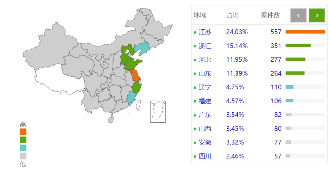 從全國(guó)來看,江蘇、浙江、河北、山東、遼寧五個(gè)省份的案件數(shù)量先后位列前五名,對(duì)此,該地區(qū)的相關(guān)從業(yè)者必須提起應(yīng)有的重視!