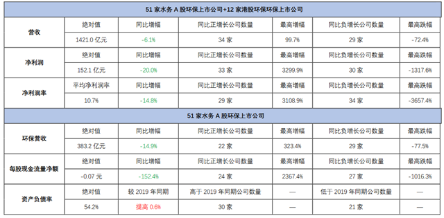總體來看,2020年上半年水務A股及港股環(huán)保上市公司營收總額同比下降,A股環(huán)保上市公司環(huán)保營收總額同比下滑;整體獲利能力不及上年同期,凈利潤總額和凈利潤率均同比下滑;現(xiàn)金流情況不及上年同期,負債水平較上年同期小幅上升。