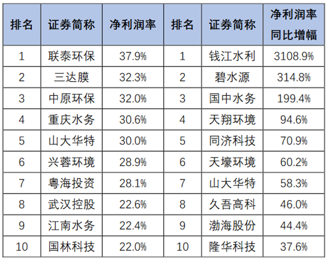 2020年上半年水務(A股+港股)環(huán)保上市公司凈利潤率及其同比增幅TOP10