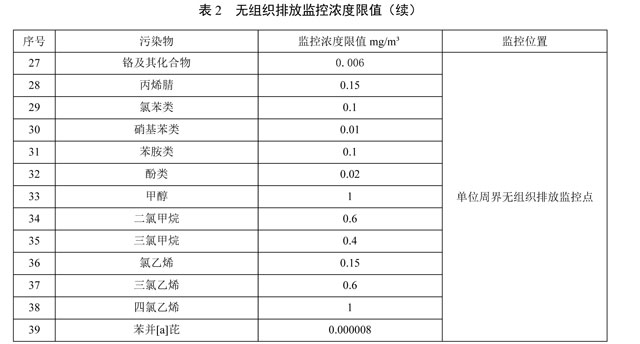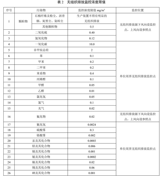 4.1.2 固定污染源無組織排放監(jiān)控濃度限值執(zhí)行表2的規(guī)定。新建污染源自本標準實施之日起執(zhí)行,現(xiàn)有污染源自2022年7月1日起執(zhí)行。