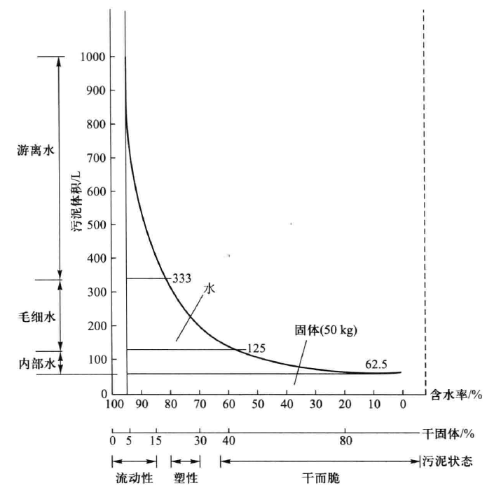 從污泥含水率與污泥狀態(tài)的關(guān)系圖可以看出,為了便于污泥處置時的運輸,污泥要脫水,使含水率降至80% 以下,失去流態(tài)。通常,若污泥進行填埋,其含水率要在60% 以下。