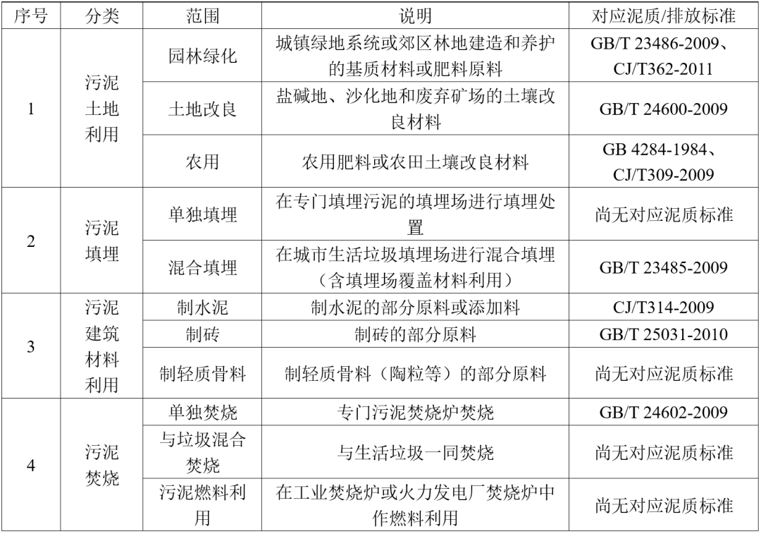 2009-2011年在住建部主導(dǎo)下,編制出臺了一批城鎮(zhèn)污水處理廠污泥處理處置標(biāo)準(zhǔn),其中《GB/T23484-2009城鎮(zhèn)污水處理廠污泥處置 分類》中明確給出四類共11條處置路線,與這些處置路線對應(yīng)出臺(延用)了一系列泥質(zhì)標(biāo)準(zhǔn)。
