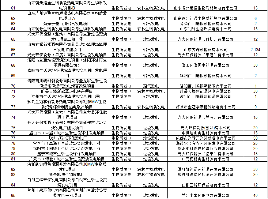 10月30日,國家電網(wǎng)有限公司已將完成公示的第六批次可再生能源發(fā)電項目補貼項目清單上報國家主管部門,本次公布的2020年第六批可再生能源發(fā)電補貼項目清單中,生物質發(fā)電項目總計85個,其中垃圾焚燒發(fā)電項目52個,沼氣發(fā)電項目8個,農林生物質發(fā)電項目25個,清單如下。