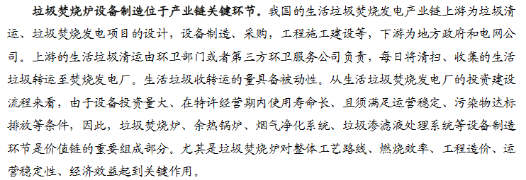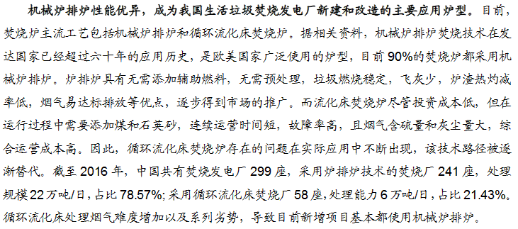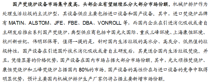 垃圾焚燒發(fā)電行業(yè)進(jìn)入運(yùn)營高峰期,市場(chǎng)擴(kuò)張和運(yùn)營效率成核心關(guān)注點(diǎn)。機(jī)械爐排爐漸成主流技術(shù)路線,國產(chǎn)垃圾焚燒爐占主要份額。中原證券分析如下: